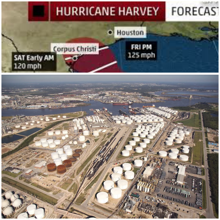 Foto de portada: Iconografía de la trayectoria del Huracán Harvey, y Terminal de Combustibles y Petróleo de Houston (EEUU).